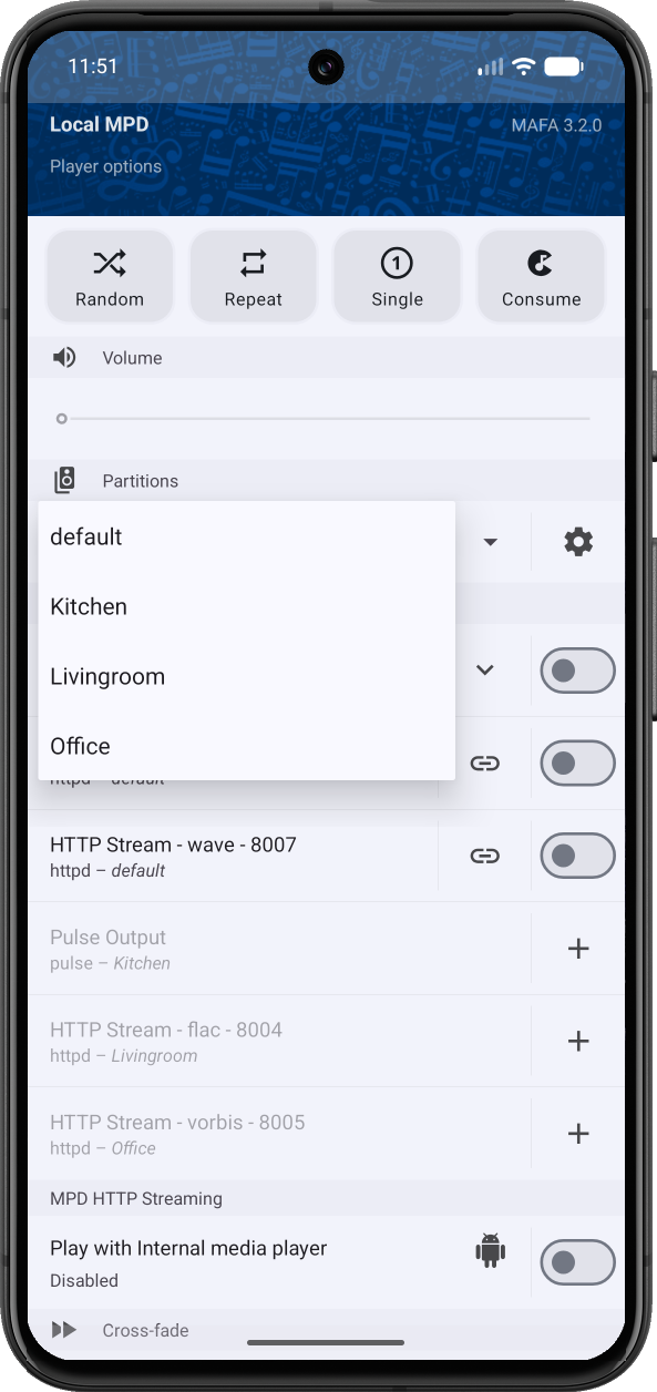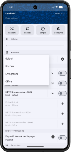 Partitions in MPD are separate players each with its own playback queue and outputs.