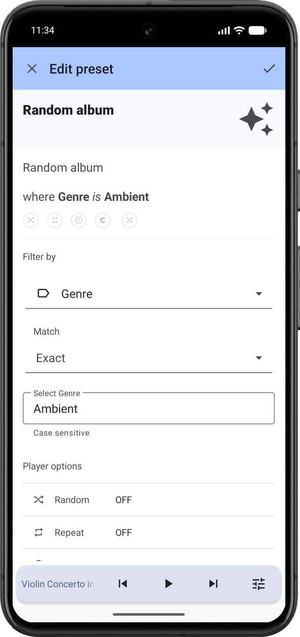 Presets are configurable custom play actions. Each preset defines the tracks to add to the player queue and player options to set: random, repeat, consume, and shuffle.