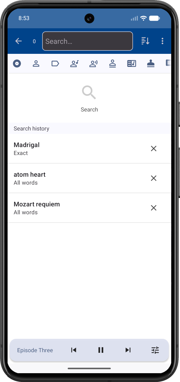 When there are no search results, the list of the latest search terms is shown.Selecting a search term from the list will repeat that search.A search term is added to the list only when leaving the search view.
