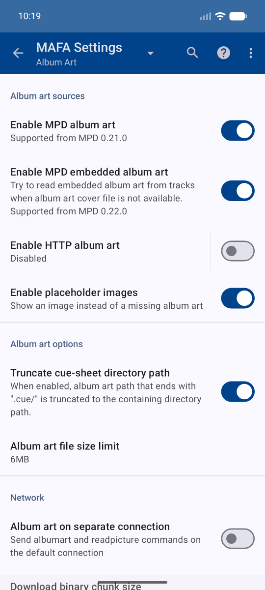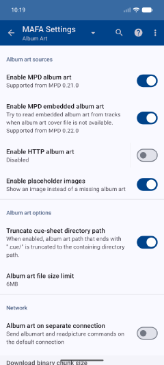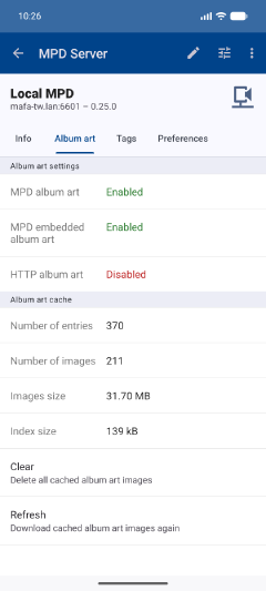 Alternatively you can setup an album art HTTP server. In that case, remember to turn off Settings → Album Art → Enable MPD Album art.