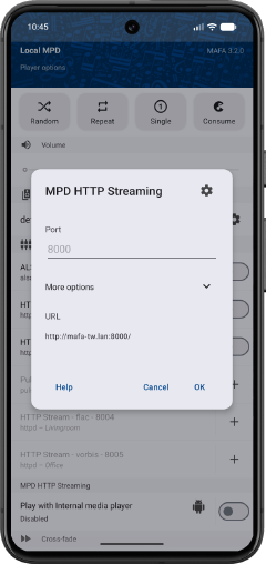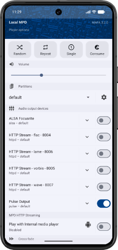 }From the player options enable the configured output and MPD HTTP Streaming.