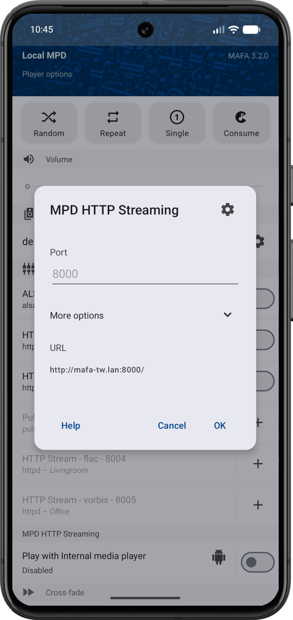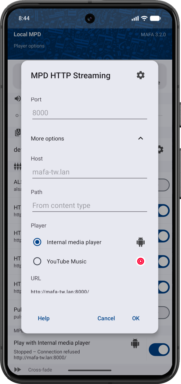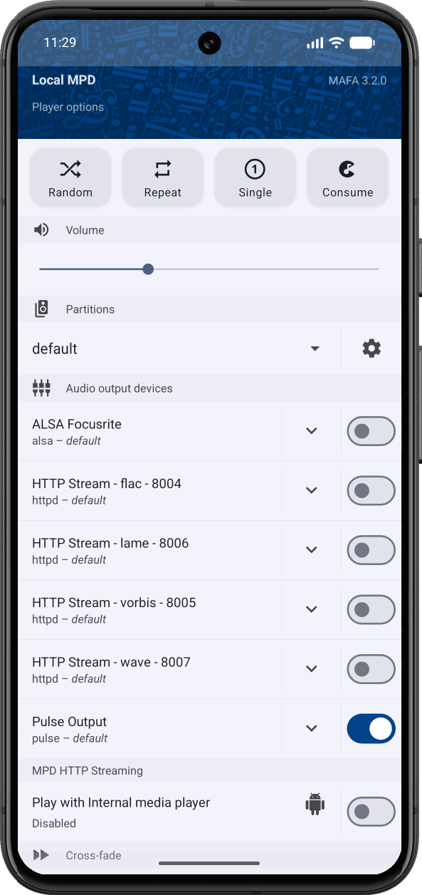 }From the player options enable the configured output and MPD HTTP Streaming.