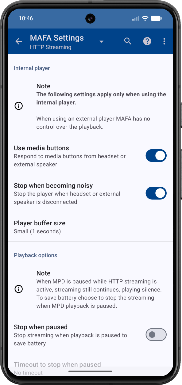 When MPD is paused while HTTP streaming is active, streaming still continues, playing silence. To save battery choose to stop the streaming when MPD playback is paused.