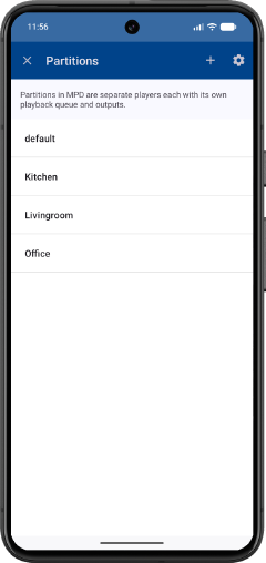 Partitions in MPD are separate players each with its own playback queue and outputs.