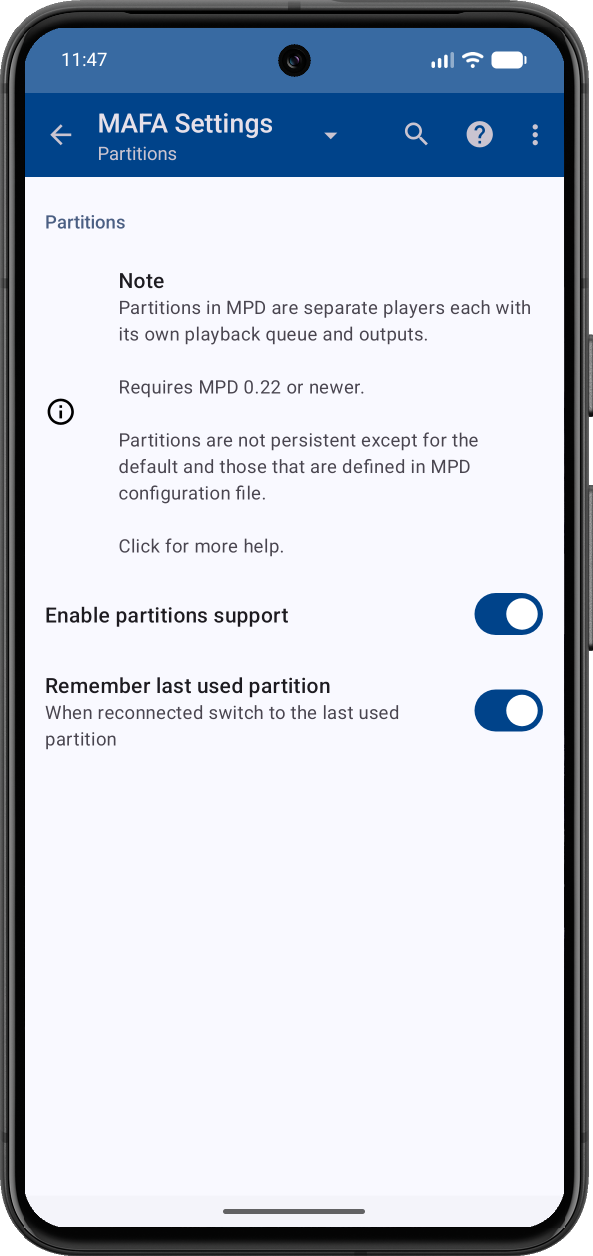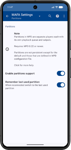 If checked, MAFA will select the last used partition when it connects to MPD server. Otherwise it always starts in the default partition.