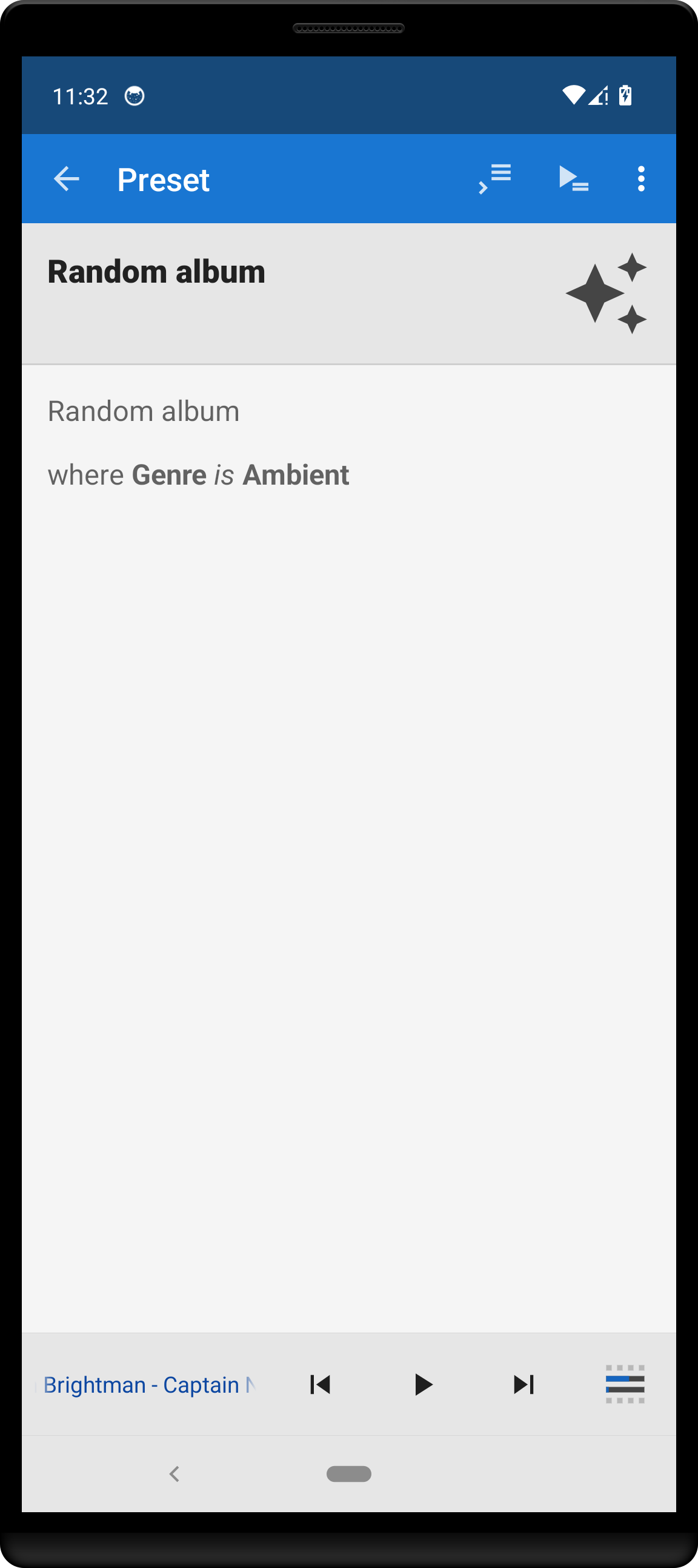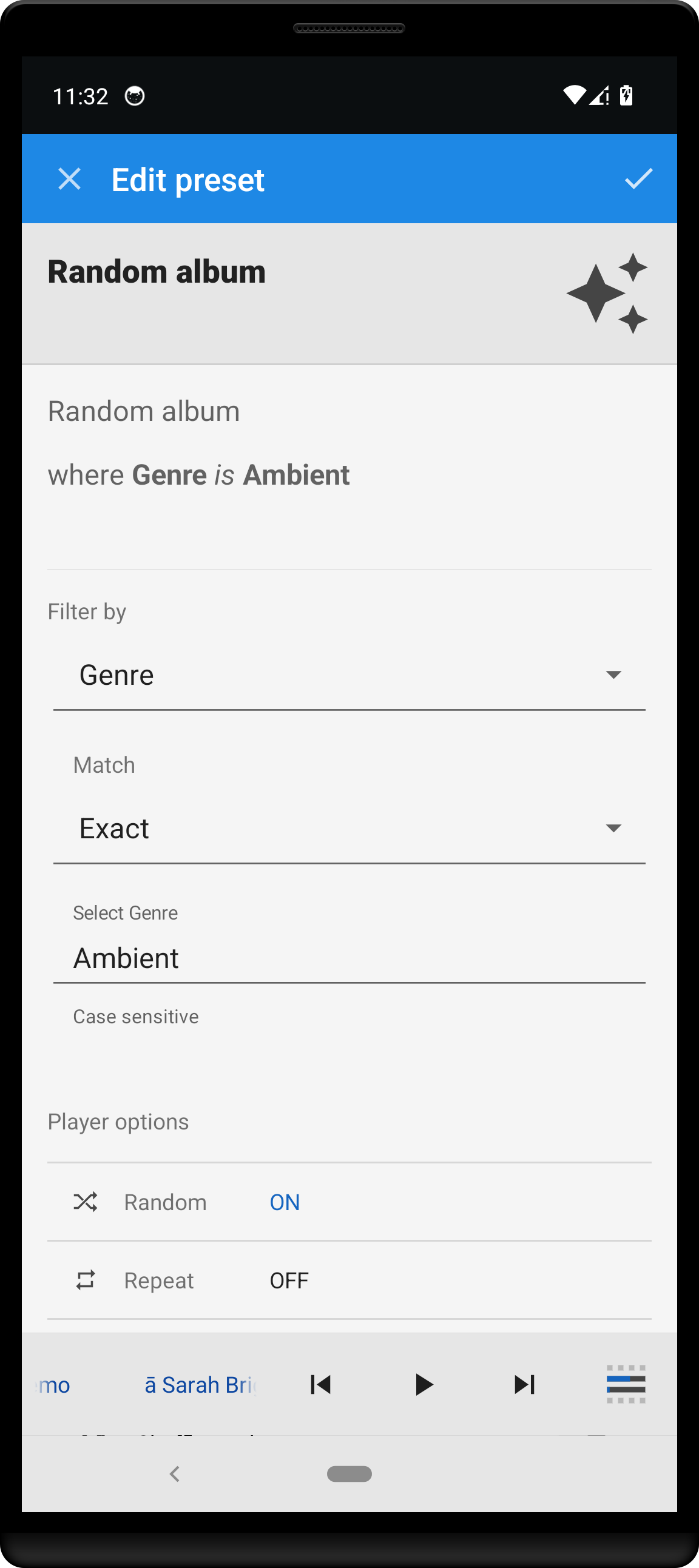 - New: define presets to play random album, or all tracks, with options to limit selection to tag values and apply player options.