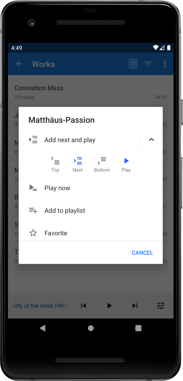 - New add-to-queue options: add to the player queue at top or bottom, or insert as next, and optionally start playing the added tracks.