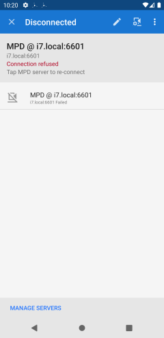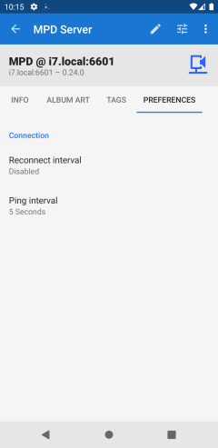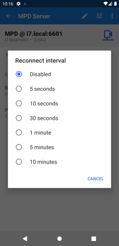 Added option to disable auto-reconnect per MPD server. Select the auto-reconnect interval from the server Preferences tab in the MPD server details view.